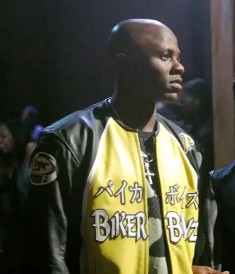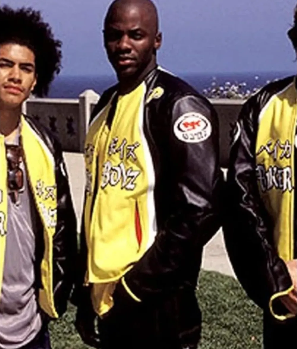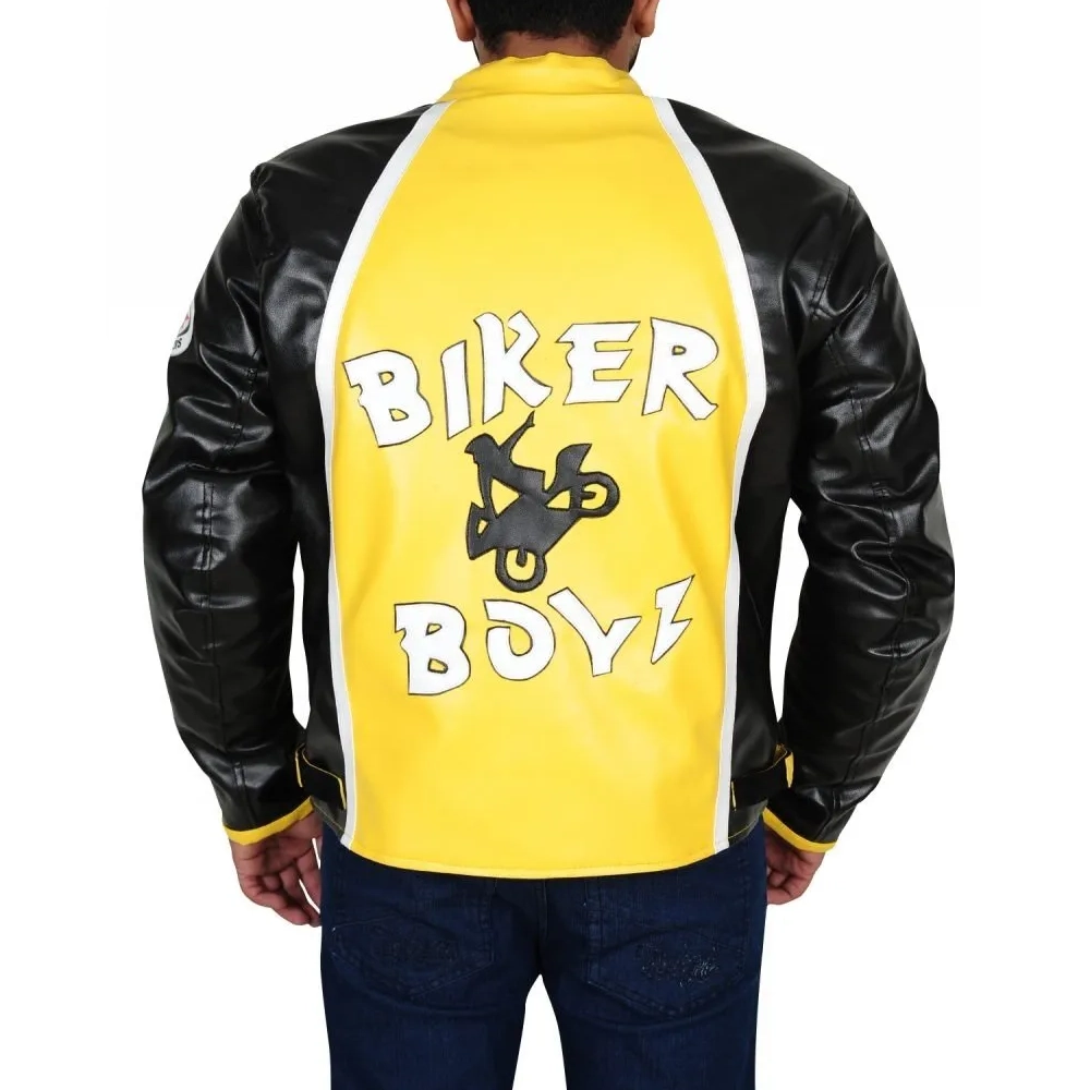 Derek Luke Biker Boyz Movie Front Japanese Lettering, White Racing Stripes & Biker Boyz Back Graphic Yellow and Black Motorcycle Jacket