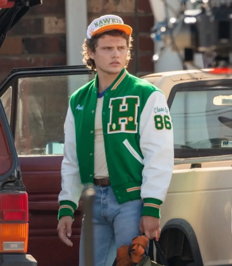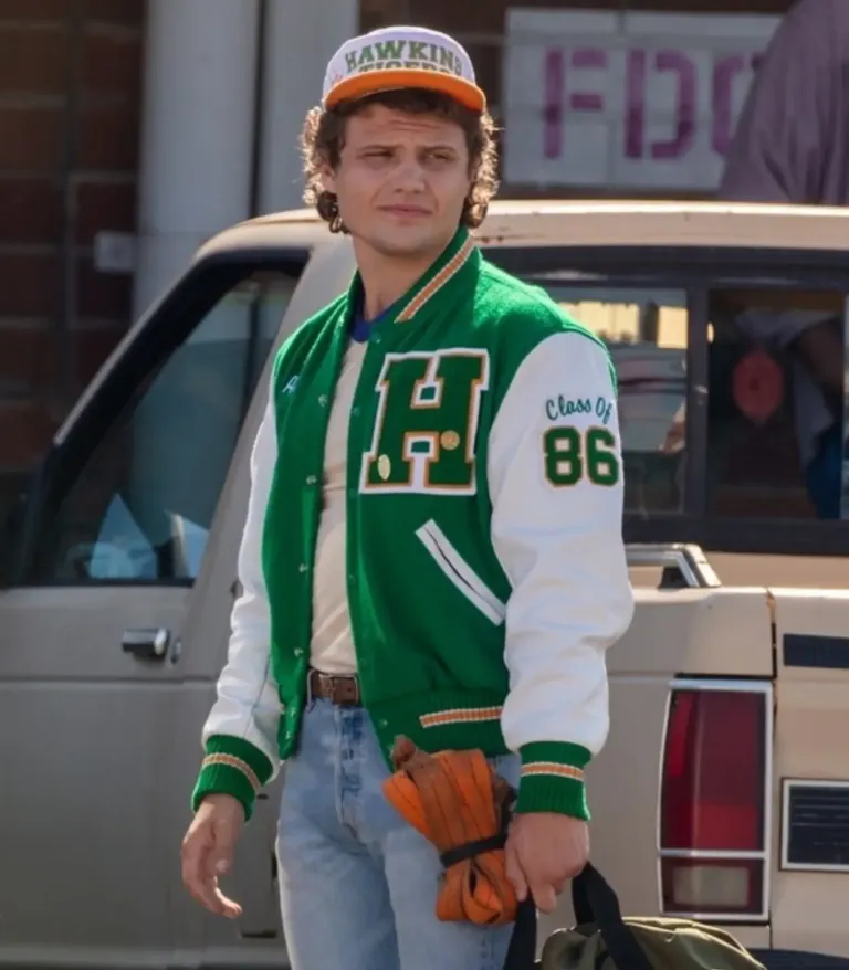 Pay tribute to the leader of the Hellfire Club with the Eddie Munson Stranger Things jacket, a piece that perfectly captures the 80s Hawkins High aesthetic. While Eddie is famous for his rocker denim, this green and white varsity style represents his high school roots seen during the intense and nostalgic moments of Season 4. For fans looking to replicate Joseph Quinn’s legendary screen presence, this Eddie Munson letterman jacket offers an authentic look that balances vintage school spirit with the dark, supernatural vibes of the show. It is a standout choice for those wanting to own a piece of television history that remains a fan favorite across the globe.