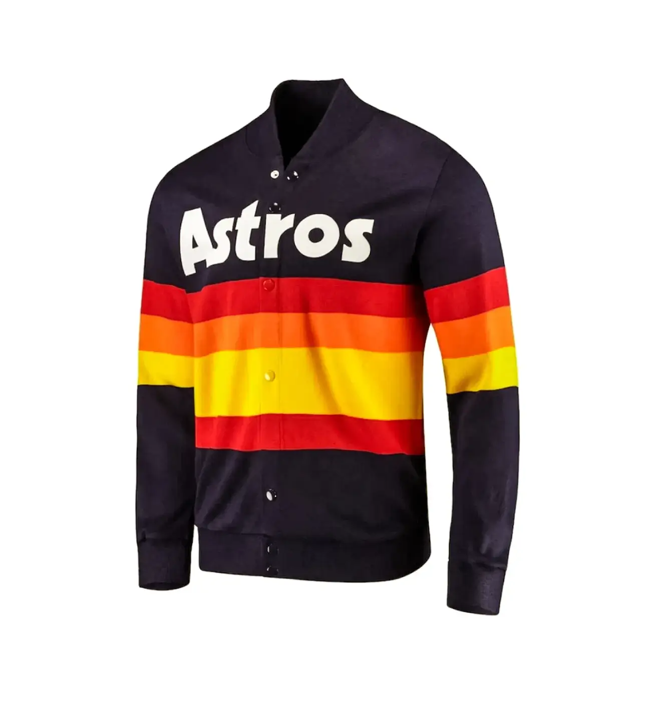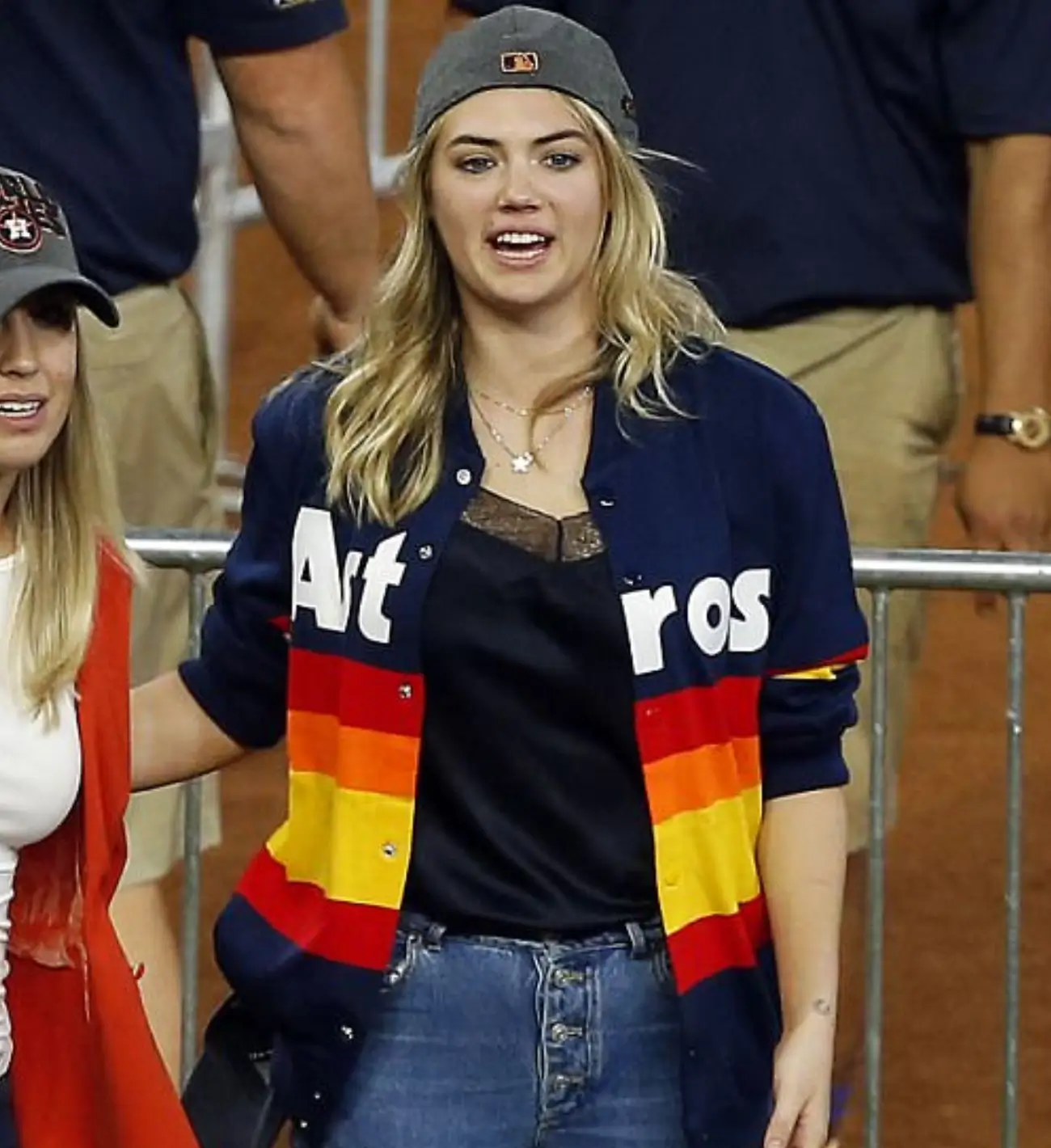Celebrate the championship spirit of Houston with the Kate Upton Astros blue jacket, a piece that became a fashion icon during the Houston Astros’ post-season victory celebrations. Kate Upton famously wore this vibrant knit-style sweater jacket at the stadium to cheer on her husband, Justin Verlander, instantly making it one of the most searched pieces of MLB fan gear. If you are looking for an authentic Kate Upton Houston Astros jacket that offers a cozy, retro aesthetic, this multi-colored fleece recreation is the perfect choice. It allows fans to replicate her exact stadium look, combining sports pride with a trendy, oversized silhouette that stands out in any crowd.