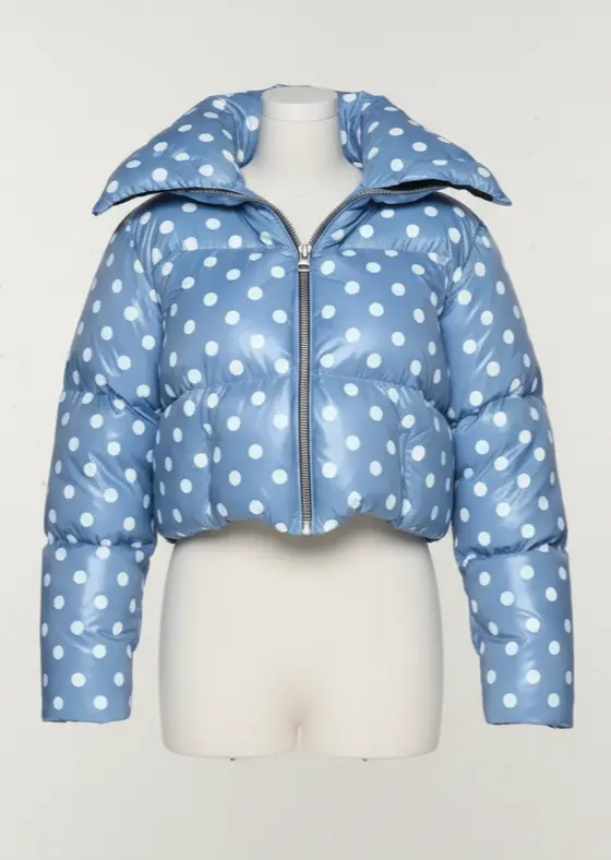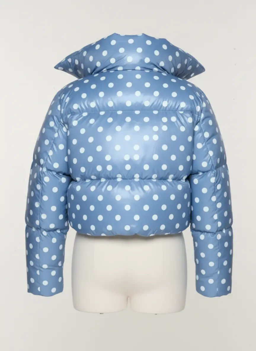 This Lily Allen polka dot jacket has a simple zipper in the front and ribbed cuffs that keep the cold out. The wide collar adds extra style, and the long sleeves give you full coverage. It’s lightweight and warm exactly what you need for winter.