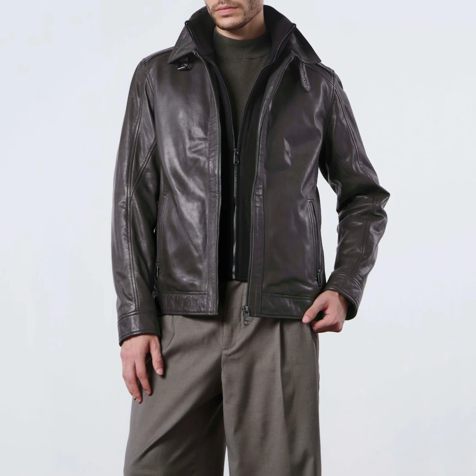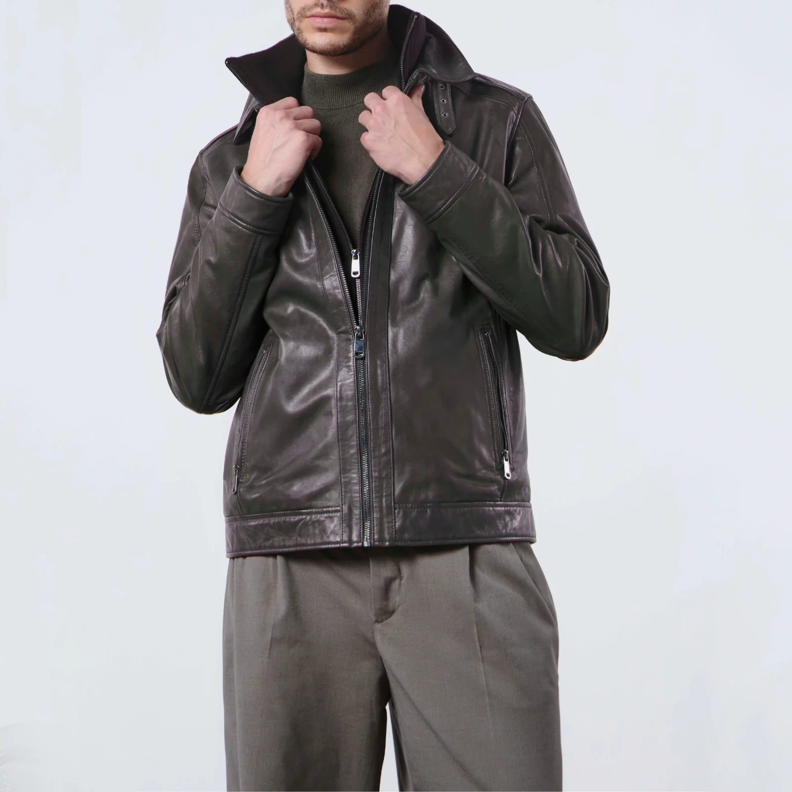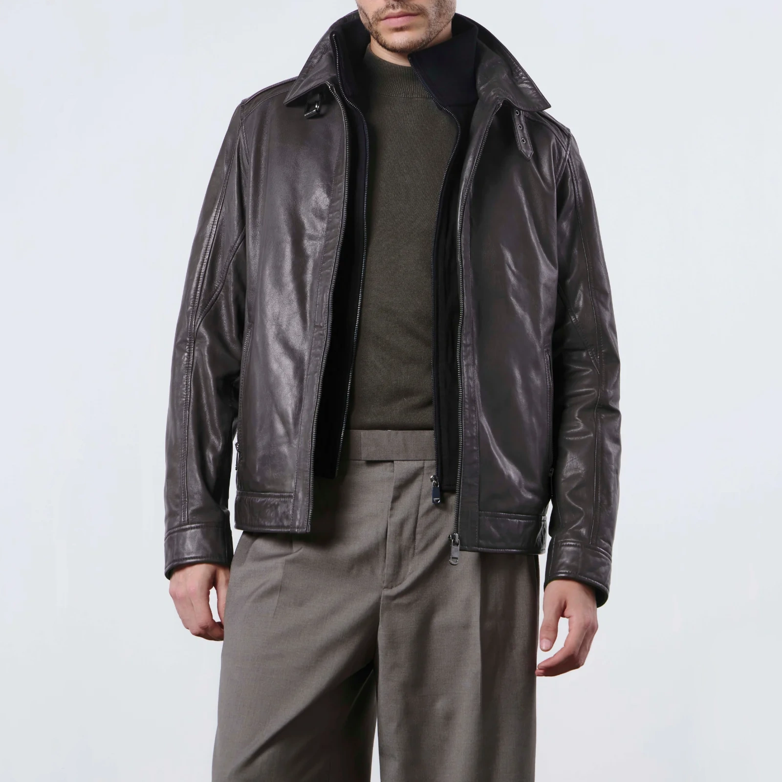 Men’s Dark Brown Leather Bomber Jacket with Hybrid Design