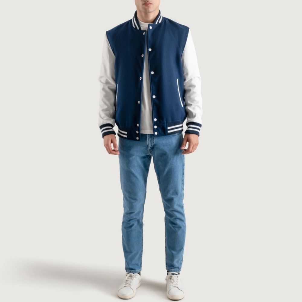 Men’s Navy Blue Wool & White Leather Varsity Jacket