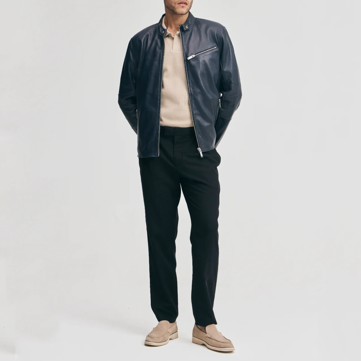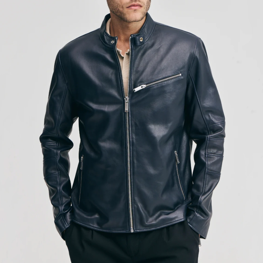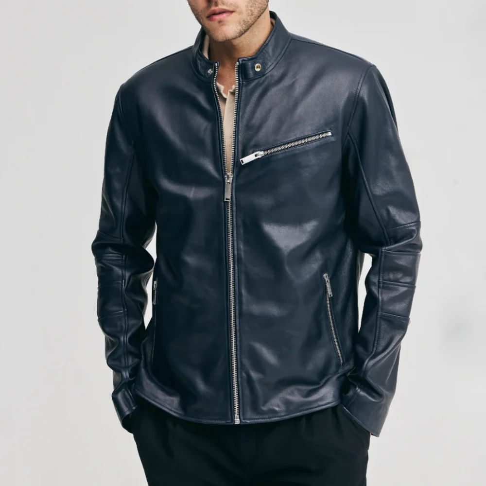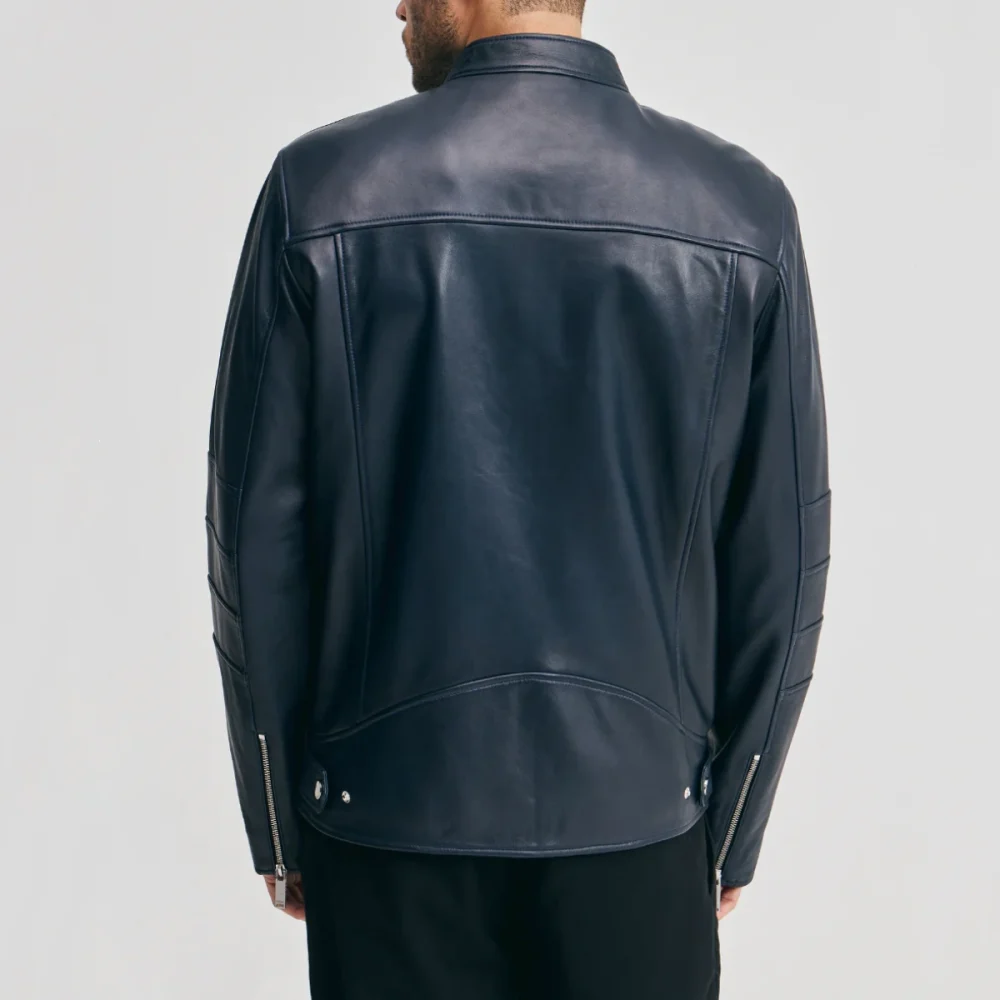 Men’s Navy Leather Moto Jacket with Chest Zip Pocket