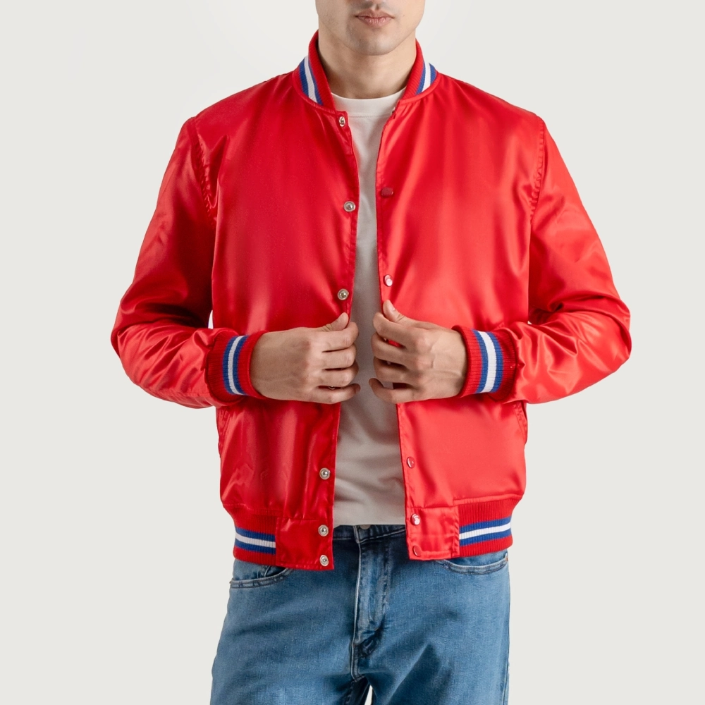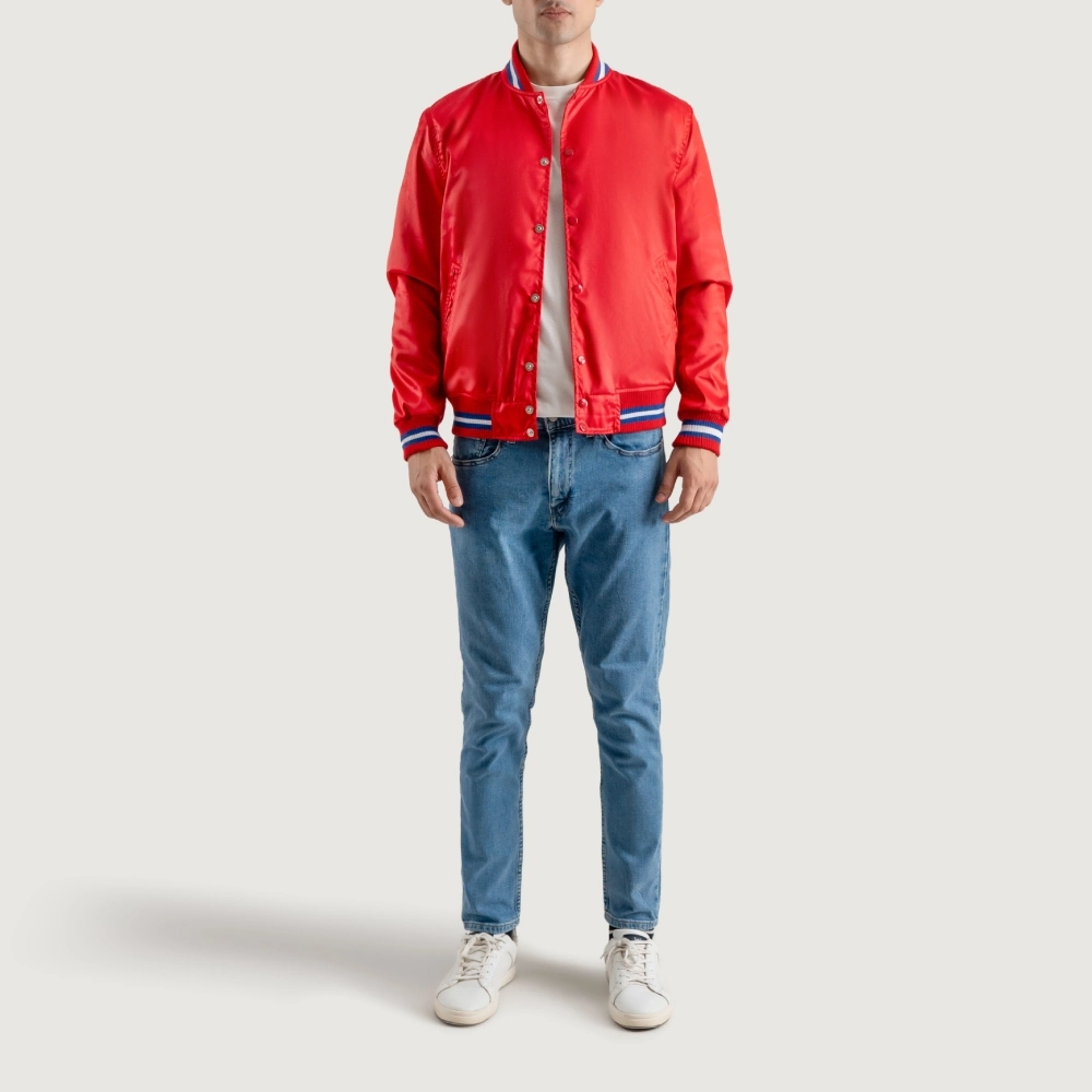 Men’s Red Satin Varsity Jacket With White Stripes