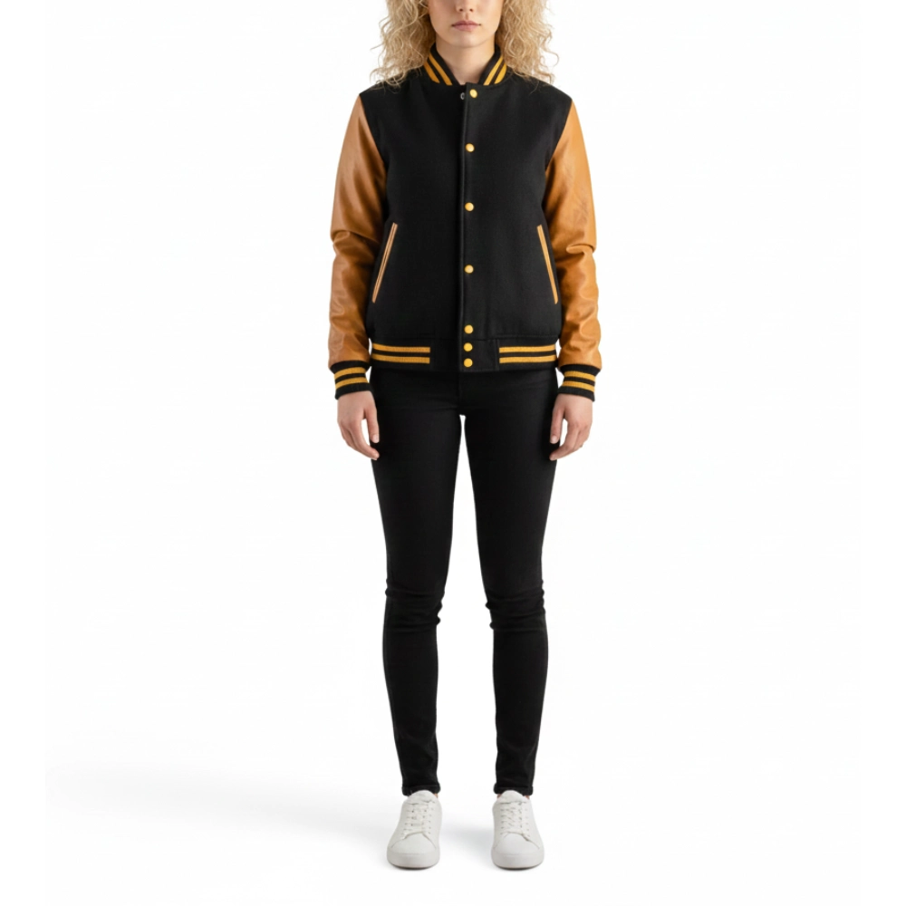 Women’s Black Wool & Gold Leather Varsity Jacket