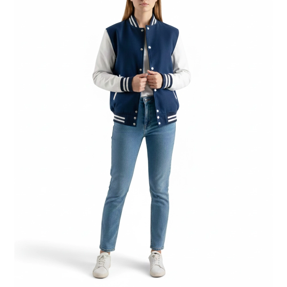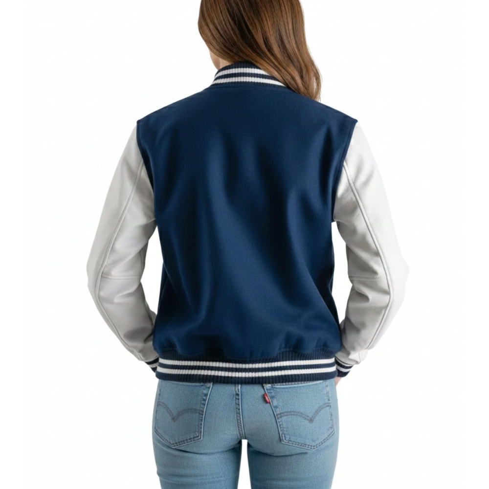 Women’s Navy Blue Wool & White Leather Varsity Jacket
